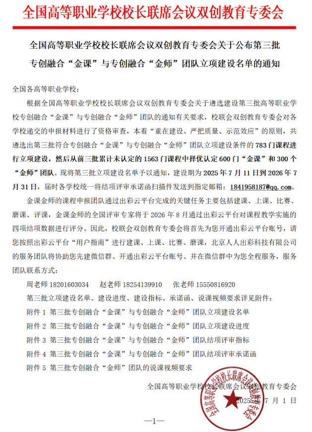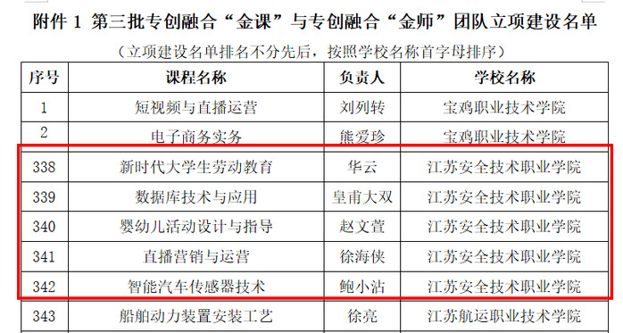 近日,全国高等职业学校校长联席会议双创教育专委会(以下简称“校联会双创教育专委会”)公布第三批专创融合“金课”与“金师”团队立项建设名单,我校推荐申报的《智能汽车传感器技术》等5门课程成功入选立项建设名单。