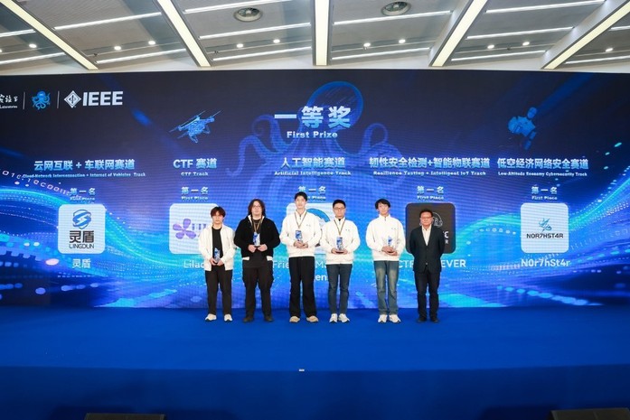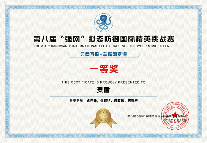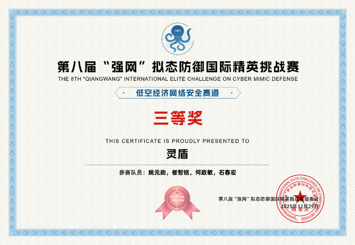 第八届强网拟态防御国际精英挑战赛于近日在南京紫金山实验室正式落下帷幕,经过72小时激烈角逐,我校石春宏老师和三名优秀毕业生崔智铭、何政敏、姚元勋组成的“灵盾战队”奋勇拼搏,从全球40支国际顶尖战队中脱颖而出,一举夺得“云网互联+车联网”赛道第一名,荣获赛道一等奖。在低空经济网络安全赛道获得第五名,荣获三等奖。成绩的取得充分展现了我校学子扎实的专业功底与卓越的实战能力。