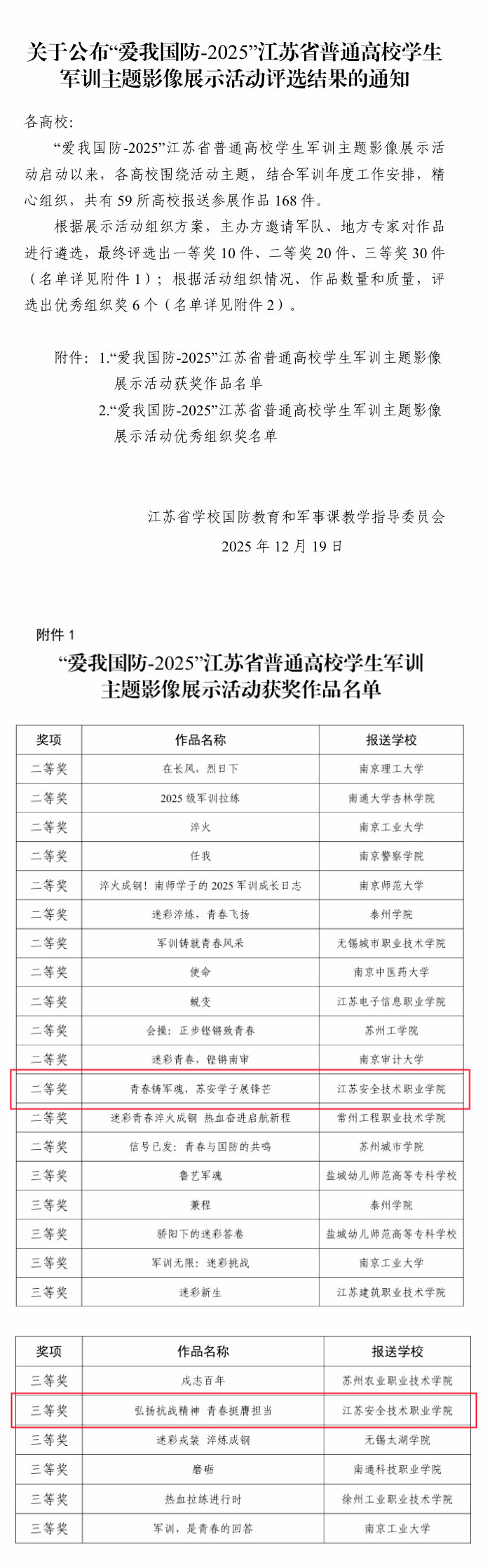 近日,江苏省学校国防教育和军事课教学指导委员会公布2025年江苏省高校学生军训主题影像展示活动评选结果,我校人民武装部报送的参赛作品《青春铸军魂,苏安学子展锋芒》荣获二等奖、《弘扬抗战精神青春挺膺担当》荣获三等奖。