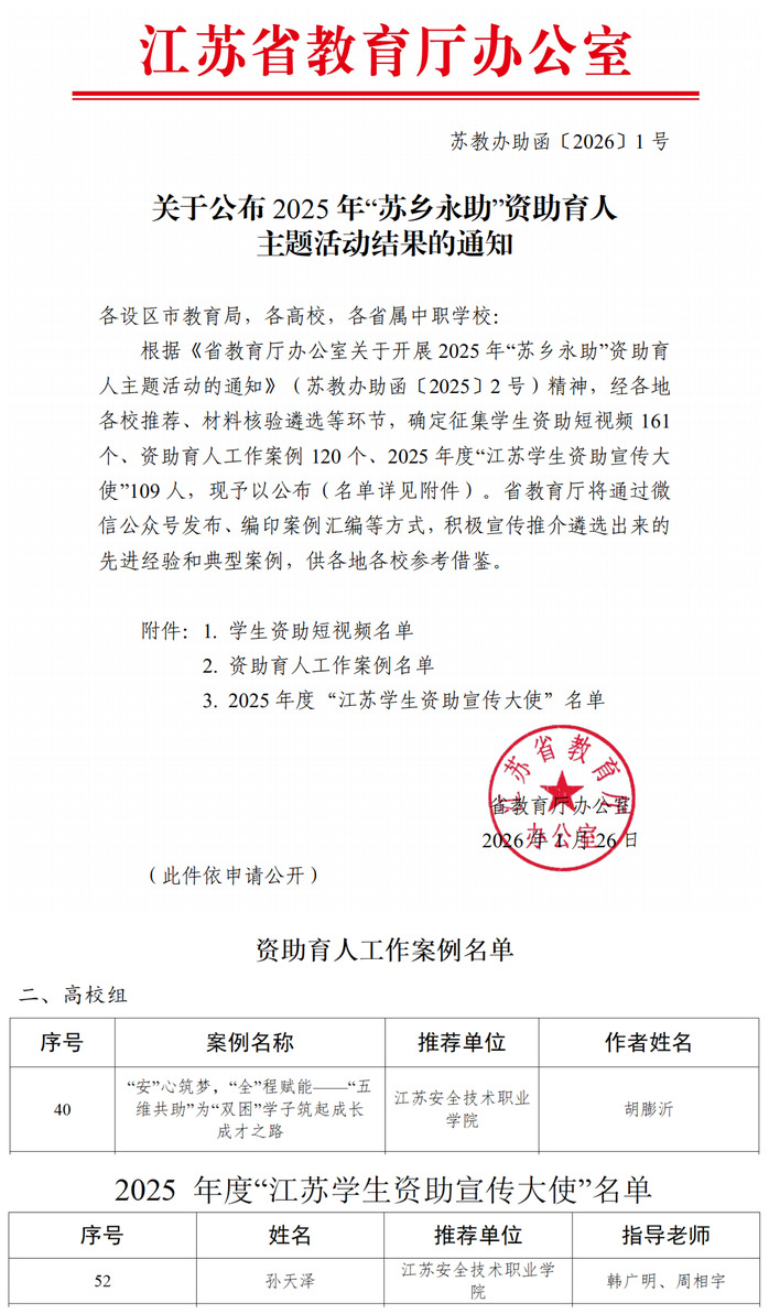 近日,江苏省教育厅下发《关于公布2025年“苏乡永助”资助育人主题活动结果的通知》(苏教办助函〔2026〕1号)。我校喜获两项荣誉。其中,工业安全与职业健康学院辅导员胡膨沂老师的案例《“安”心筑梦,“全”程赋能——“五维共助”为“双困”学子筑起成长成才之路》获评“资助育人工作案例”;智能制造与应急装备学院韩广明、周相宇老师指导的学生孙天泽荣获“江苏学生资助宣传大使”称号。
